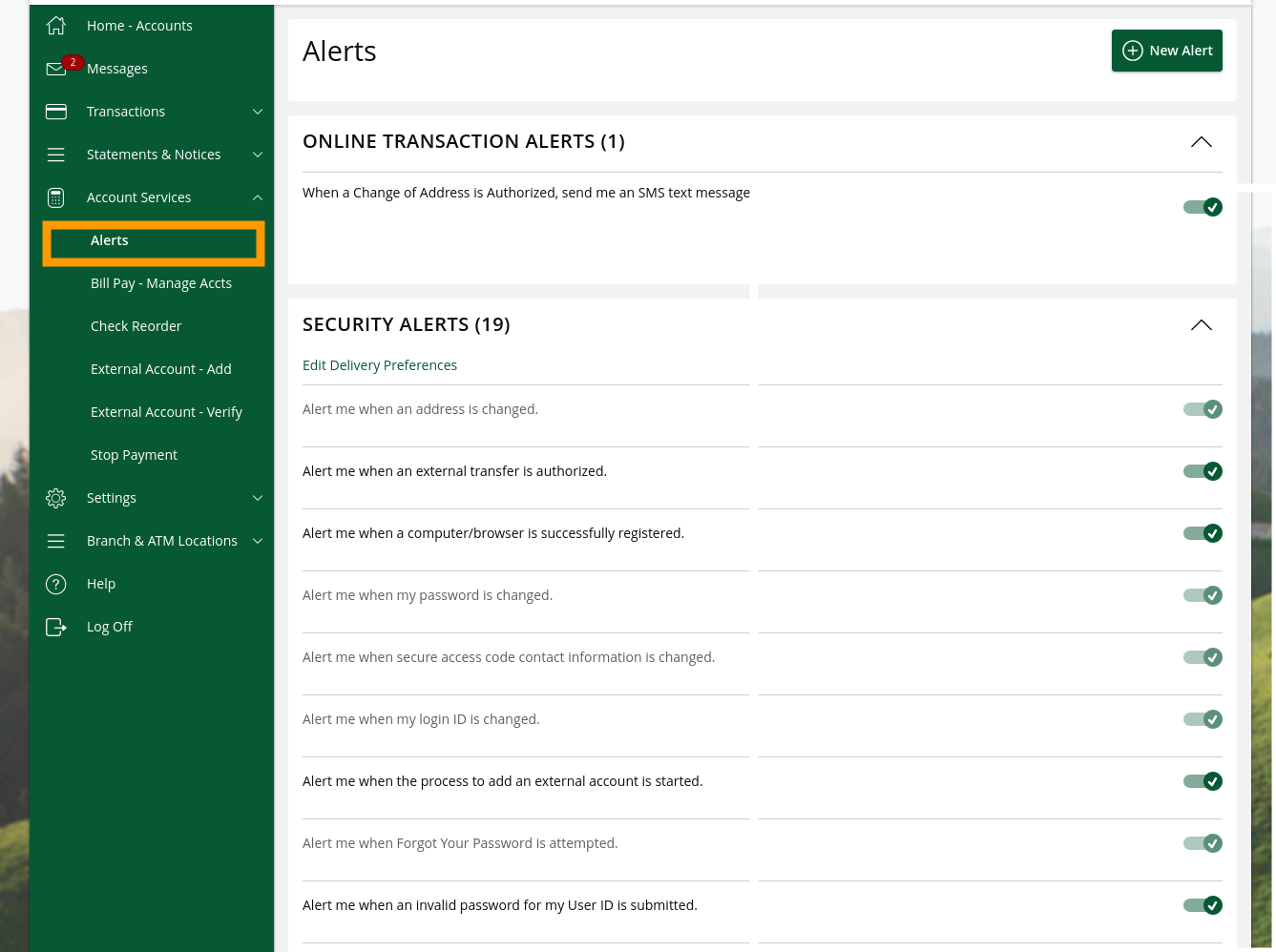 - Secure Message: Alerts appear in your digital banking Messages inbox